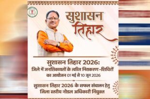 और पढ़ें »अम्बिकापुर : सुशासन तिहार 2026: जिले में जनशिकायतों के त्वरित निराकरण हेतु शिविरों का आयोजन 01 मई से 10 जून 2026