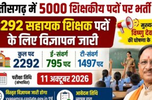 रायपुर मुख्यमंत्री विष्णु देव साय द्वारा की गई घोषणा के अनुरूप स्कूल शिक्षा विभाग अंतर्गत कुल 5000 शिक्षकीय पदों पर भर्ती की प्रक्रिया प्रारंभ की जा रही है। इसी क्रम में स्कूल शिक्षा विभाग द्वारा सहायक शिक्षक के 2292 पदों पर भर्ती हेतु विज्ञापन जारी किया जा रहा है। इन ...