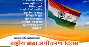 भोपाल मुख्यमंत्री डॉ. मोहन यादव ने प्रदेशवासियों को राष्ट्रीय झंडा अंगीकरण दिवस की शुभकामनाएं दीं है। मुख्यमंत्री डॉ. यादव ने कहा कि यह तिरंगे की आन-बान-शान को वैश्विक स्तर पर निरंतर बढ़ाने का पावन अवसर है। मुख्यमंत्री डॉ. यादव ने राष्ट्रीय झंडा अंगीकरण दिवस पर देशवासियों को कर्तव्य निर्वहन के ...