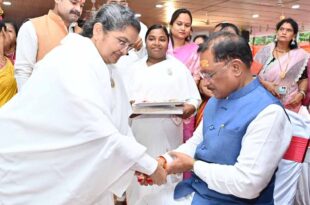 रायपुर, रक्षाबंधन के शुभ अवसर पर प्रजापिता ब्रह्मकुमारी ईश्वरीय विश्वविद्यालय, रायपुर की संचालिका ब्रह्मकुमारी सविता बहन ने मुख्यमंत्री श्री विष्णु देव साय से उनके निवास कार्यालय में सौजन्य भेंट की और उन्हें रक्षा-सूत्र बाँधकर उनके स्वास्थ्य, दीर्घायु और सुखद जीवन की मंगलकामना की। मुख्यमंत्री श्री साय ने ब्रह्मकुमारी बहनों का ...